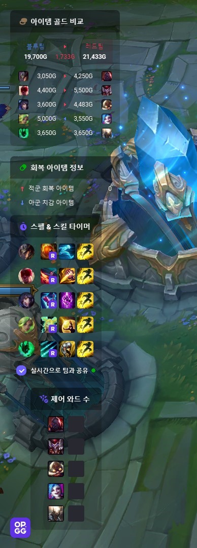 OP.GG 프로그램의 오버레이 탭입니다! 보시면 스펠&스킬 체크, 인게임 로딩 정보, 제어 와드 사용 정보 등등 많은 정보를 인게임에서 볼 수 있습니다.